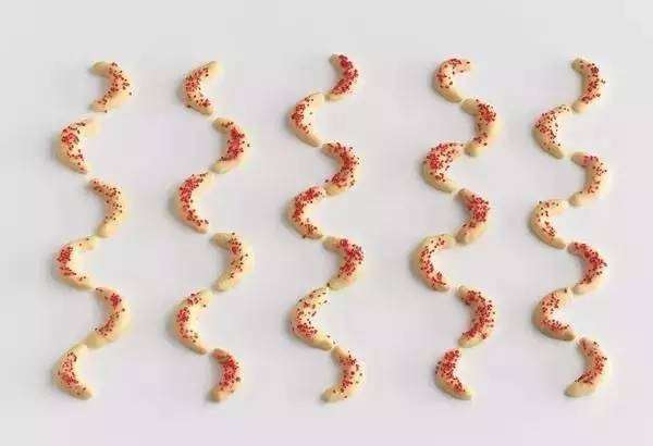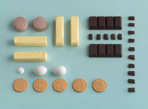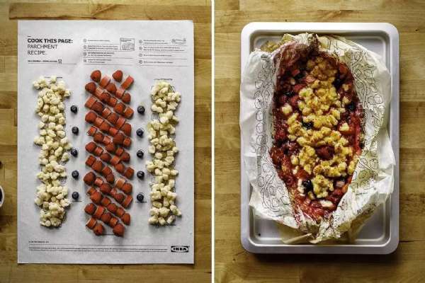 這不是一本普通的食譜書,它的特別之處在于,把每一種食材的用量都畫出來了,你只需要把對應的食材和配料放在對應的圖形里,就像填色游戲那樣簡單。最重要的是,宜家超市賣的食材大小和說明書上的圖形尺寸是完全一致的。然后,你把所有的食材混在一起,把紙包起來,放進烤箱就行了……