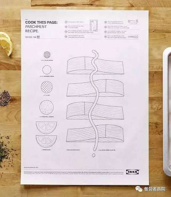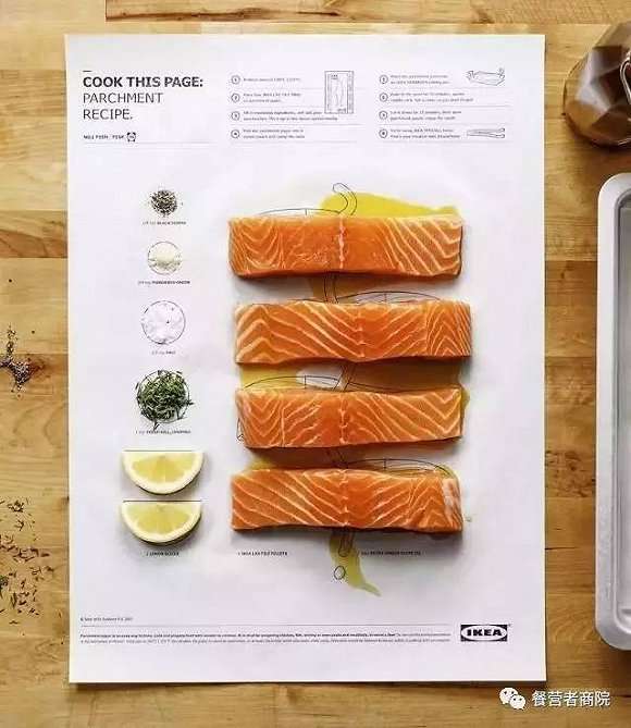 餐營者們,發現宜家的城府和心機了嗎?這張超Fun的食譜【絕對、不僅僅】是用來解救下廚無能星人的!從食譜作用的食材,到處理食材的小工具,裝盤用的碗盤、用餐的餐具水杯,再到廚房清潔、收納的各類小配件,直至整個廚房空間的規劃設計、家具的打造、園藝的延伸,宜家全部都有~以一張食譜帶動廚房全線產品以及延伸產品的銷售,就問你:服不服?