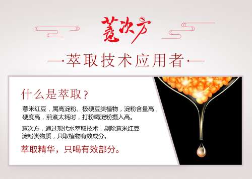 薏次方是利用現代植物萃取技術,將薏米和紅豆通過30倍濃縮萃取,只取有效成分。