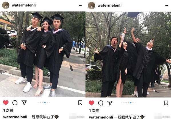 照片中,豆得兒大玩各種拍照姿勢,先和攬著男同學雙雙嘟嘴,或是做出撩裙POSE露出短褲和逆天長腿,騎一名男同學肩膀,同時又摸另一個男生的臉頰。她也和一群女同學雙手托腮,以同樣坐姿入鏡,露出膝下小腿和纖細玉手,最后也沒忘記空拋學士帽,并留言“一眨眼就畢業了。”