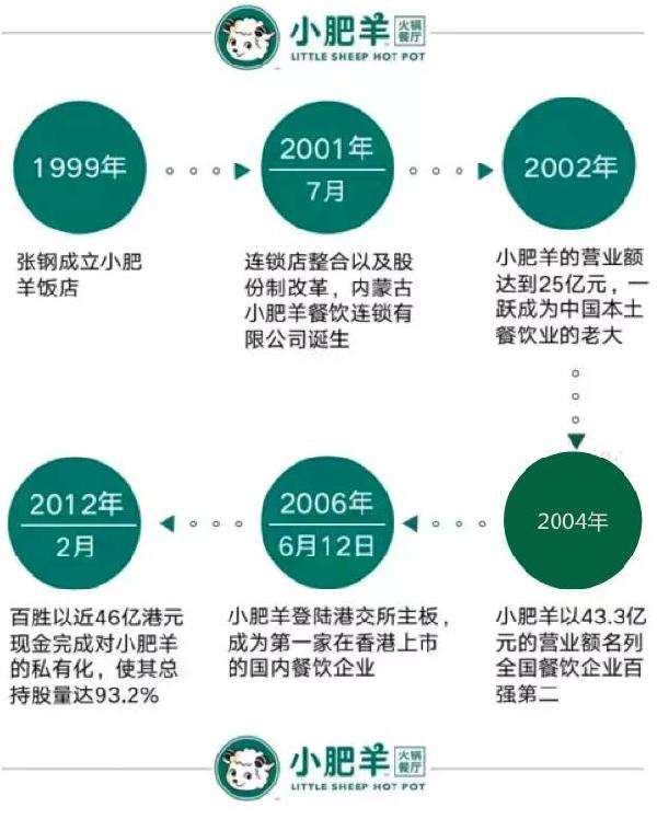 2002年,小肥羊的營業(yè)額就達到25億元,一躍成為中國本土餐飲業(yè)的老大。2004年,小肥羊以43.3億元的營業(yè)額名列全國餐飲企業(yè)百強第二,全國門店數(shù)量最高峰時達到721家。2006年6月小肥羊再下一城,首開國內餐飲行業(yè)引進外資風投的先河,引入3i和PraxCapital兩家私募基金共計2500萬美元投資。并于2008年6月12日登陸港交所主板,成為第一家在香港上市的國內餐飲企業(yè)。