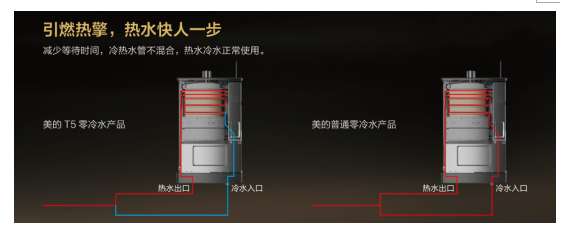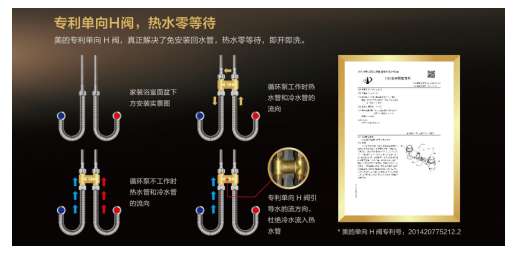 深入研究市場后發現,中國城鎮家庭普遍采用的是無回水管道的“冷熱水管雙管”布局。今年7月,美的即將推出的T5燃氣熱水器很好的解決了這個問題,該新品考慮了中國家庭的實際情況,采用專利單向H閥,真正解決了免安裝回水管,其零冷水技術通過在熱水器中內置循環水泵,當熱水器檢測到回水管中水溫低于用戶所設置的保溫溫度時,立即啟動循環水泵回收水管中的冷水并進行加熱,直至達到設定溫度,從而實現“花灑未開,熱水已在”的零冷水體驗。