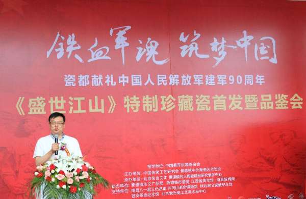 7月1日上午,“鐵血軍魂·筑夢(mèng)中國(guó)”瓷都獻(xiàn)禮中國(guó)人民解放軍建軍九十周年《盛世江山》特制珍藏瓷首發(fā)暨品鑒會(huì)在南昌江西省美術(shù)館隆重舉行。200余位領(lǐng)導(dǎo)、來(lái)賓,文化界、工藝美術(shù)界專(zhuān)家、大師齊聚一堂,重溫建軍歷史,共憶崢嶸歲月,并一同見(jiàn)證千年瓷都匠心巨制《盛世江山》特制珍藏瓷的盛大發(fā)布。