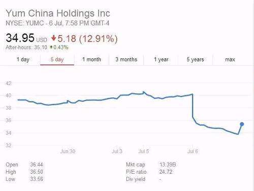 昨天(7月6日),肯德基和必勝客的母公司百勝中國(Yum China)在美股市場遭遇了一次突如其來的暴跌,跌幅高達12.91%。