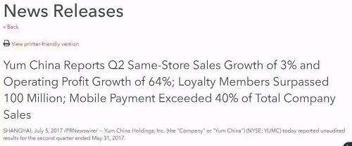 7月5日,百勝中國公布了2017財年第二季度財報,涵蓋了2017年3月至5月的財務數據。