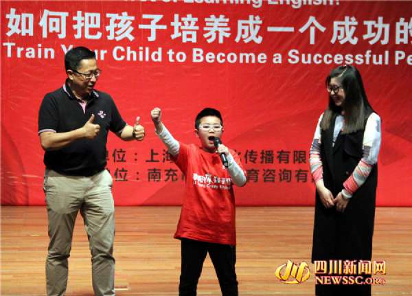 4月16日,李陽(yáng)老師正在鼓勵(lì)一名孩子大膽的喊出英語(yǔ),為全場(chǎng)的孩子和家長(zhǎng)作示范。