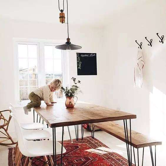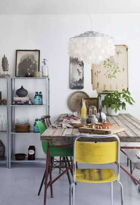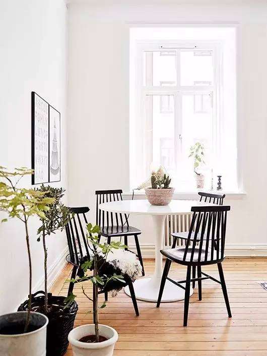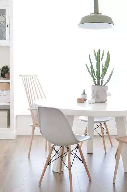 只要不要上面馬爸爸的那樣的全套好了。哪怕淘張舊的實木桌,再像下面這樣配上白色溫莎椅,效果也比上面的“清奇”畫風好很多好嘛!