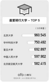 根據5月騎行單量,排名前五的大學為北京大學(分數線,專業(yè)設置)、華中科技大學、復旦大學(分數線,專業(yè)設置)-邯鄲校區(qū)、中國人民大學(分數線,專業(yè)設置)、北京航空航天大學(分數線,專業(yè)設置)。由此可以看出,北京大學的學生最愛騎行和體育運動,或許正是這樣狂熱的騎行氛圍感染了ofo小黃車的創(chuàng)始團隊,就此催生出全球首創(chuàng)的無樁共享單車模式。