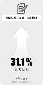ofo大數據分析平臺顯示:由于共享單車騎行便利、時間可控的特點,高考期間,17歲至20歲用戶單量增長了20%,且單量增速前五大省份均為高考大省,湖南位居第二。此外,為支持高考,減少噪音污染,改善交通情況,全國人民興起綠色出行,共享單車全國總單量在高考期間的增速達到了31.1%,創(chuàng)造了自端午節(jié)以來的又一個高點。