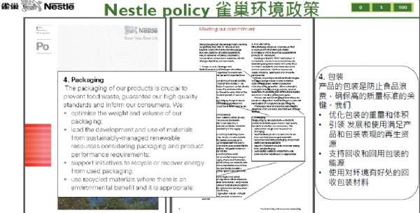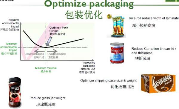 雀巢是目前全球最大的食品公司,有超過一萬種產(chǎn)品,有各種各樣的包裝形式和包裝材料。雀巢認(rèn)為自己對(duì)環(huán)境承擔(dān)著更重的責(zé)任,并且一直注重包裝不過度,盡量減少包裝對(duì)環(huán)境的影響,盡量重復(fù)使用或者環(huán)保使用。雀巢的政策就是優(yōu)化整個(gè)包裝的重量和體積,應(yīng)用再生包裝資源,或者回收包裝里含有的能源,盡量用對(duì)環(huán)境影響較小的材料。