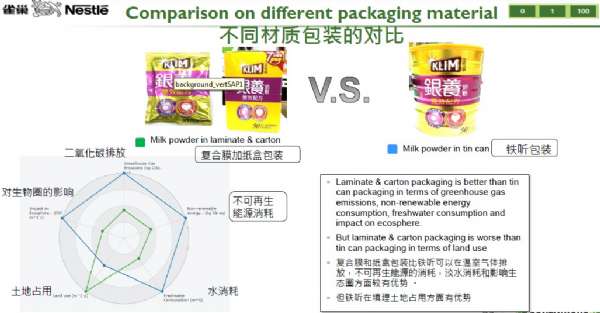 在過程中消耗的一些礦物,比如石油就是在考慮的維度中,也是加強(qiáng)考慮的因素。不同的包材消耗的礦物不一樣,雀巢會(huì)根據(jù)數(shù)據(jù)庫里的數(shù)據(jù)一一衡量,并且做實(shí)際的測(cè)算。