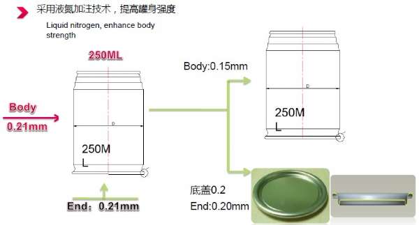 另一個(gè)應(yīng)用在鐵聽上的技術(shù)就是液氮的加注,液氮產(chǎn)生從里向外的壓力,增加抵抗外界壓力的能力,甚至一些輕微的癟罐可以反彈回來,液氮的加注首先減少了鐵的應(yīng)用,降低成本,第二減少運(yùn)輸環(huán)節(jié)的成本,第三減少了癟罐,第四對(duì)貨架期有正面作用。而且氮?dú)庖彩嵌栊詺怏w,沒有可燃性和腐蝕性,是很好的低成本材料。
