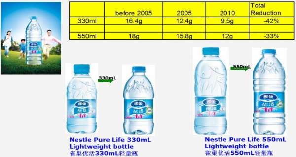 雀巢應(yīng)用的一個(gè)成功的案例就是礦泉水瓶上的減重。通過設(shè)計(jì),礦泉水瓶不僅減少了重量而強(qiáng)度并沒有顯著下降,仍然有足夠的支撐強(qiáng)度。經(jīng)過幾輪優(yōu)化設(shè)計(jì),礦泉水瓶的重量減輕程度達(dá)到百分之三十到四十五,如果按噸數(shù)來算,則是千噸級(jí)以上的減少,這對(duì)于減輕環(huán)境壓力是非常明顯的貢獻(xiàn)。