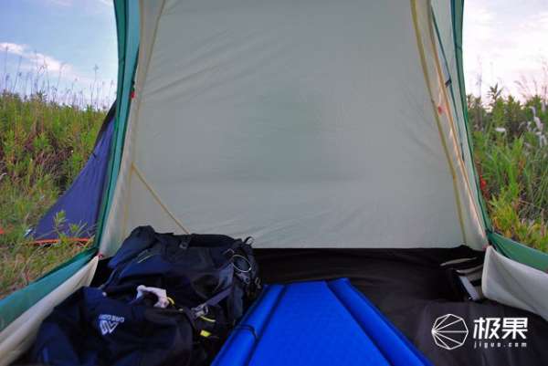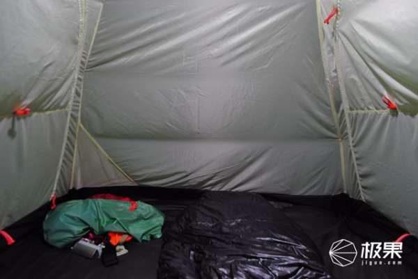 凱樂石天穹帳篷在空間布局上,新意不多,雙門雙層帳設(shè)計(jì),210mm的長度滿足大部分身高需求,140mm寬度定位于雙人帳如果考量裝備的放置略顯擁擠。110mm高度空間對(duì)于我170公分身高來說綽綽有余,整體接近1.58平方米的空間缺少門廳設(shè)計(jì)是最大遺憾。