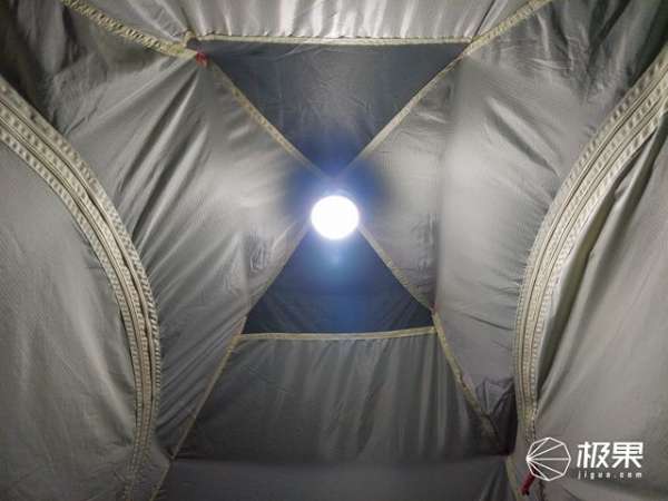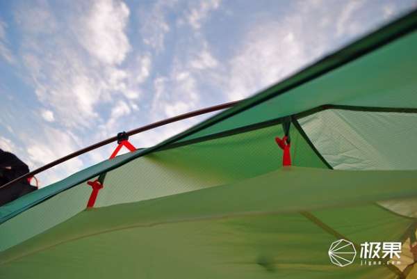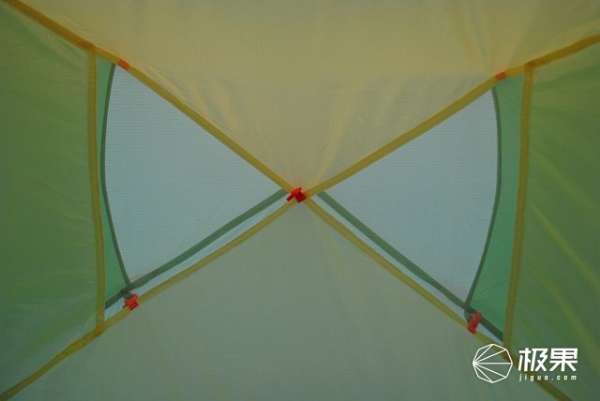 帳篷搭建飽滿度空間布局保障,內(nèi)帳支撐性從實(shí)際效果來看也是能接受的,內(nèi)外賬之間使用扣件連接,掛點(diǎn)與外帳帳桿掛點(diǎn)位置接近,受力點(diǎn)完善了內(nèi)帳的舒展,雖然內(nèi)帳部分區(qū)域飽滿度與外帳比有一些聳塌現(xiàn)象存在,但是不影響內(nèi)部整體空間,也不影響內(nèi)外賬之間間隙。