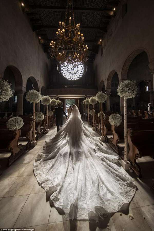 雪白的婚紗配上50萬顆施華洛世奇水晶