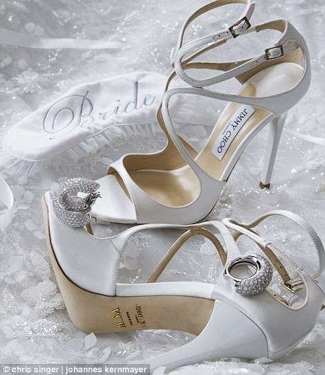 婚鞋來自Jimmy Choo品牌,搭配婚紗的耳飾當然來自施華洛世奇