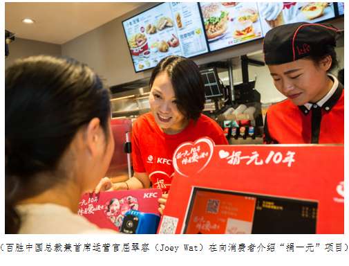 “需要為您加上一元的愛心捐款嗎?”張夢雪站在柜臺后笑容可掬地向點(diǎn)完餐的顧客說道,而屈翠容則在柜臺向消費(fèi)者詳細(xì)介紹什么是“捐一元”項(xiàng)目。這位百勝中國總裁兼首席運(yùn)營官向每位顧客悉心講解著捐出的這一元錢的去處:“捐一元是由肯德基所屬的百勝中國發(fā)起的一個公益項(xiàng)目,今年是這個項(xiàng)目運(yùn)營的第十個年頭。您的一元愛心捐款將變成雞蛋和牛奶,用來改善貧困地區(qū)兒童的營養(yǎng)狀況。”