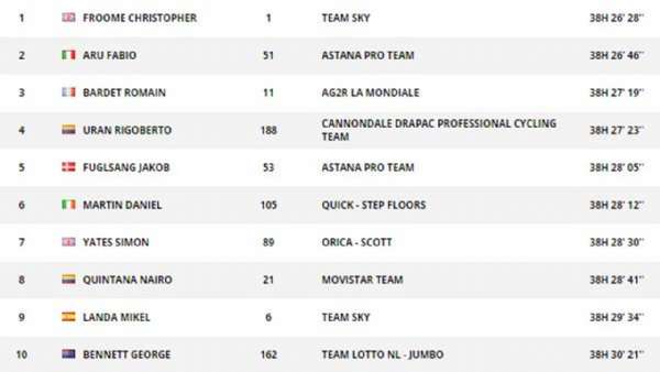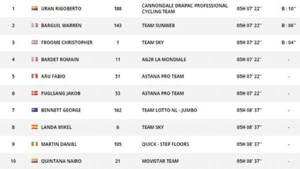 弗魯姆、波特、巴代、金塔納、烏蘭、阿魯、丹·馬丁七人形成最終GC集團,幾度拉扯過后金塔納掉隊。弗魯姆一波加速追上了早先進攻的福格爾桑,此時貓墻爬坡即將結(jié)束。主車群前方此刻只有昨天參與突圍的巴吉爾一人,手握15秒領(lǐng)先優(yōu)勢進入最后26公里。