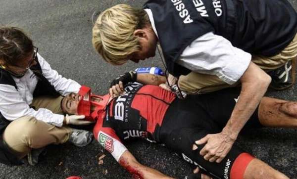 但這些預(yù)測都不忘加一個前提——如果波特能三周都不出事,順利完賽。不知道是否因為過往的經(jīng)歷影響,當(dāng)天空眾將在杜塞爾多夫的壞天氣中一騎絕塵時,波特的表現(xiàn)有些低于期待。但對比巴爾韋德,至少他的環(huán)法還能繼續(xù)。前幾個山地賽段,第9賽段直到那個下坡之前,波特一直能跟上弗魯姆。而天空山地火車看上去確實沒有以前那么強(qiáng)悍……然而和2015年環(huán)意以及去年環(huán)法一樣,厄運再一次不期而至。