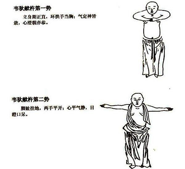 主要分為韋馱獻杵第一勢、韋馱獻杵第二勢、韋馱獻杵第三勢、摘星換斗勢、倒拽九牛尾勢、出爪亮翅式、九鬼拔馬刀勢、三盤落地勢、青龍?zhí)阶荨⑴P虎撲食勢、打躬勢、掉尾勢。