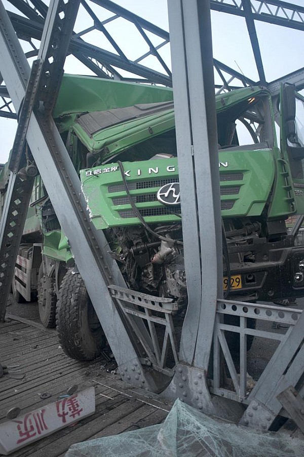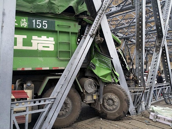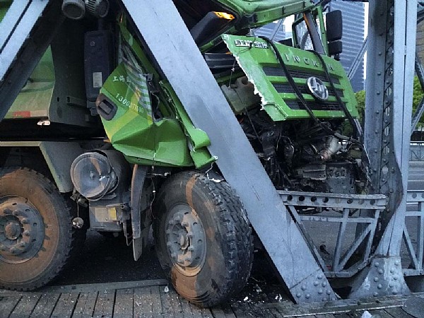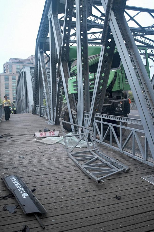 4月25日晨5:00左右,一輛車號滬DP9929的土方車由南向北駛上外白渡橋時,車輛突然失控,一頭撞向右側(cè)外白渡橋鋼架。