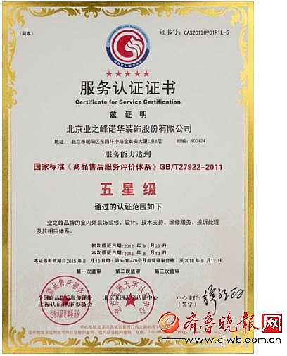 在很多消費(fèi)者看來(lái),裝修是一個(gè)低端行業(yè),服務(wù)問(wèn)題一大堆,讓人鬧心。針對(duì)這些痛點(diǎn),業(yè)之峰著力打造高品質(zhì)、全方位的服務(wù)體系,幫助消費(fèi)者解決裝修困擾。2012年9月26日,經(jīng)過(guò)第三方嚴(yán)格評(píng)審,業(yè)之峰以其卓越的服務(wù)體系,榮獲最高等級(jí)標(biāo)準(zhǔn)——五星級(jí)服務(wù)認(rèn)證,從而成為家居行業(yè)第一家、也是唯一一家通過(guò)五星級(jí)服務(wù)認(rèn)證的企業(yè)。