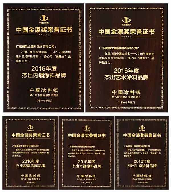 中國金漆獎秉承對高品質(zhì)的追求,至今已成為中國涂料行業(yè)最具影響力、最具公信力、最權(quán)威的年度品牌活動。美涂士在這次的評選中,攬獲“年度杰出內(nèi)墻涂料”、“年度杰出木器涂料”、“年度杰出家具涂料”、“年度杰出藝術(shù)涂料”、“年度杰出生態(tài)涂料”等五項大獎,充分體現(xiàn)行業(yè)對美涂士品牌的認(rèn)可和贊譽(yù)。