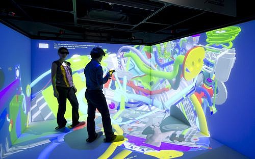 三面墻壁和地面投影加強3D 環(huán)境感和立體音效,Cave 墻壁上有跟蹤傳感器捕捉使用者在房間內(nèi)的動作,專用的眼鏡根據(jù)捕捉到的動作形成圖像。戴上眼鏡,你就感覺進入了“墻內(nèi)的世界”。