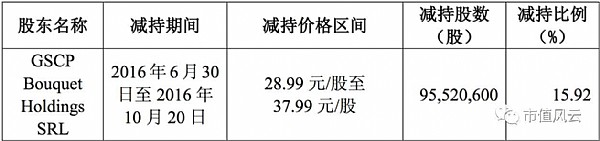 截止2016年5月,GSCP Bouquet Holdings SRL持有上市公司136,458,000股,占股份總數(shù)的22.74%,為第一大股東。按照承諾,大股東在鎖定期滿后12個月內(nèi)最多減持95,520,600股,占公司股份總數(shù)的15.92%;鎖定期滿后24個月內(nèi)可全部減持。