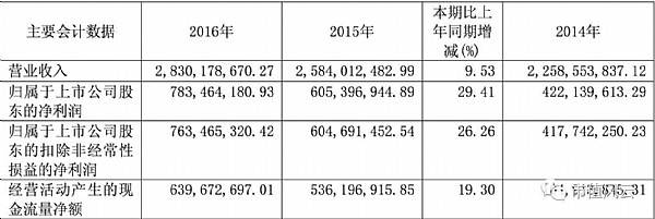 截至2016年12月31日,口子窖全年實現(xiàn)營業(yè)收入28.30億元,同比增長9.53%;歸屬于上市公司股東的凈利潤7.83億元,同比增長29.41%。2016年,三瓶酒的歸屬凈利增速分別為7.84%、8.61%、9.58%,就這一項來說,口子窖還是可以笑傲三瓶酒的。