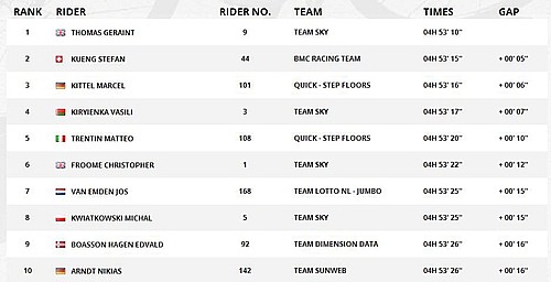 在比賽的大部分時間里,大雨繼續(xù),大家在謹(jǐn)慎中保持安全騎行。唯一的事故出現(xiàn)在最后三十公里:大集團前方領(lǐng)騎的喀秋莎-歐倍青車手在過彎時側(cè)滑,帶倒了身后一片車手,其中包括弗魯姆(天空車隊)和巴代(AG2R車隊)兩位總冠軍熱門。所幸兩人并無大礙,各自在隊友的幫助下順利回到比賽中。