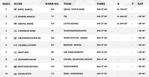 最后,在大集團的亂軍沖刺中,快步地板車隊的沖刺火車表現(xiàn)失準(zhǔn),但基特爾憑著一己之力,硬是從后排殺上,重新找到位置,并在最后100米發(fā)射,完成逆轉(zhuǎn)!
