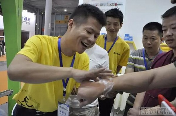 在辟水珠展位前,相關(guān)工作人員的免砸磚防水體驗(yàn)演示,把滲水終結(jié)者A組份、B組份、C組份依次兌水倒入一個(gè)裝有砂石原本水流如注的礦泉水瓶中,漏水迅速減少直至滴水不漏,現(xiàn)場(chǎng)觀眾嘖嘖稱奇。檬萌寶演示更是現(xiàn)場(chǎng)把一個(gè)觀眾手臂上久搓不掉的膏藥痕跡擦拭得一干二凈,現(xiàn)場(chǎng)觀眾拍案叫絕。