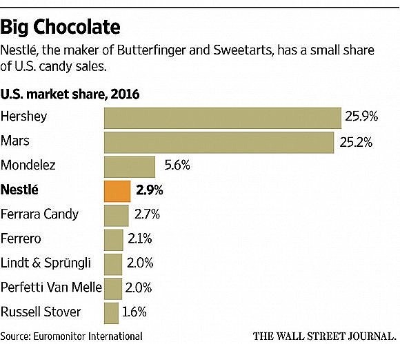在美國糖果(包括巧克力)市場,雀巢的份額被擠在好時、瑪氏和億滋的身后,只有2.9%,遠(yuǎn)低于好時的25.9%。