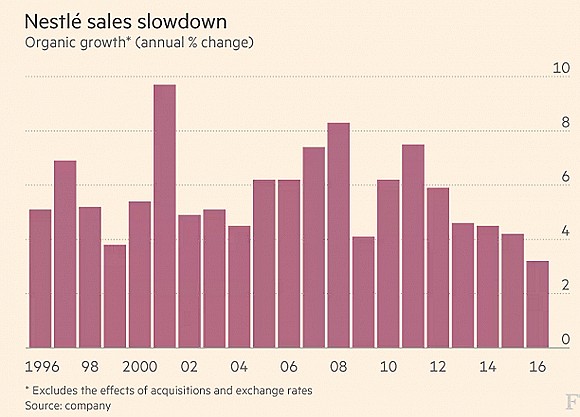 通貨緊縮、全球經(jīng)濟(jì)下行,這些經(jīng)濟(jì)大背景下,2016年雀巢迎來了20年以來收入增長率最低的一年。這個世界上最大食品飲料公司去年收入只漲了3.2%,低于預(yù)期。