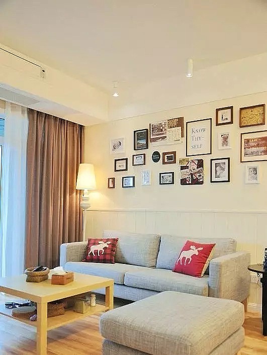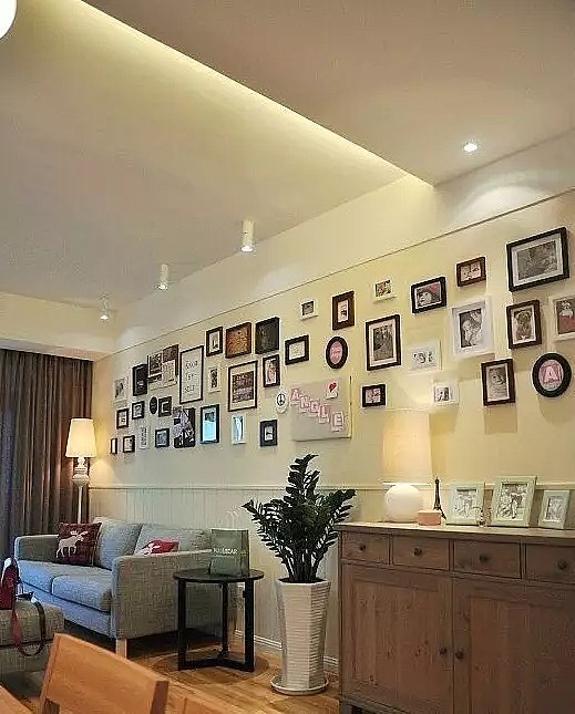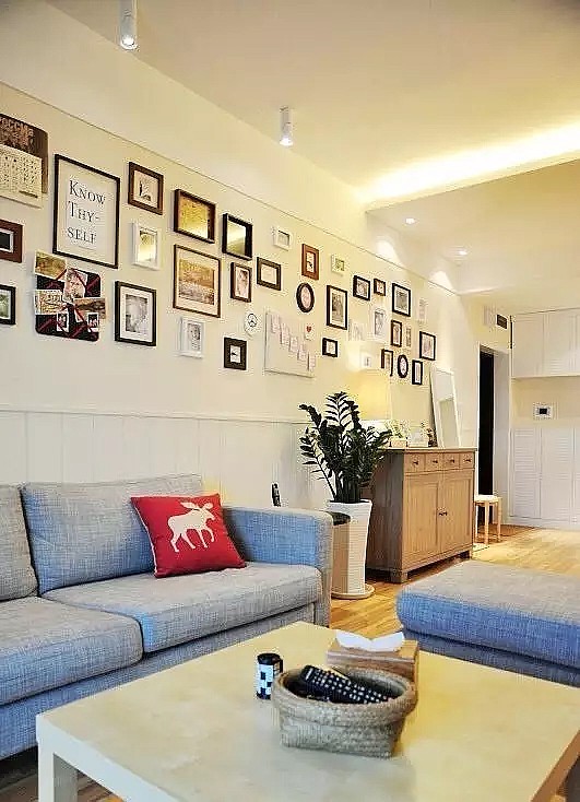 從玄關處一直延伸到了客廳的照片墻設計, 豐富了單調的墻面空間,也給客廳增添了更多的情調。