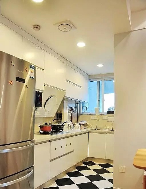 廚房是開放式的,但是油煙問題影響也不大,黑白格子地磚的設計,讓廚房變的更加的生動與活潑。