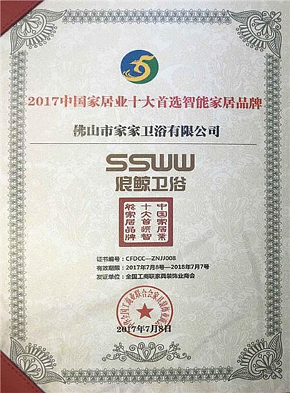 浪鯨衛(wèi)浴中國(guó)家居業(yè)十大首選智能家居品牌證書