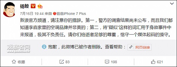 著名籃球評論員@楊毅 也微博上稱警方調(diào)查結(jié)果還沒出來,呼吁給逝者足夠的尊重,恪守一個(gè)媒體起碼的操守。
