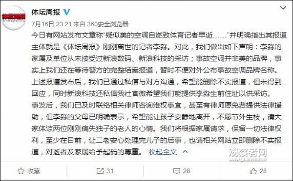 16日晚間,逝者所在單位官方微博@體壇周報(bào) 也發(fā)布聲明,表示李淼的家屬及單位從未接受過新浪數(shù)碼、新浪科技的采訪,同時(shí)事故空調(diào)并非美的品牌,還在等待警方的完整結(jié)案報(bào)道,暫時(shí)不便對外公布事故空調(diào)品牌名稱。