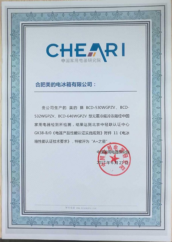 除了在食品安全衛(wèi)生上嚴(yán)格把關(guān),在技術(shù)革新、引領(lǐng)行業(yè)潮流方面,美的冰箱同樣不遺余力——就在不久前,美的BCD-530WGPZV、BCD-532WGPZV、BCD-646WGPZV三款型號(hào)冰箱因在噪聲和保鮮性能方面表現(xiàn)突出,經(jīng)權(quán)威檢測(cè)后通過北京中輕聯(lián)認(rèn)證中心的“A+認(rèn)證”,獲得了由中國(guó)家用電器研究院頒發(fā)的“A+之星”。