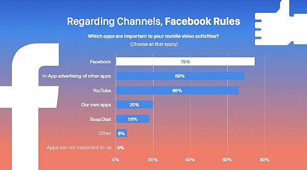 對于移動視頻廣告所投放的渠道問題75%的受訪者認為 Facebook 最為重要其次是其他應用程序中的廣告(69%)YouTube(66%)自己的應用程序(20%)和 Snapchat(18%)。