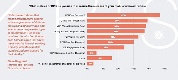“這項研究表明移動營銷人員正在使用大量不同的指標及標準來衡量移動視頻的廣告表現效果。但真實的情況是50%以上的廣告主并不會同意使用這些指標進行廣告表現追蹤這清楚地表明移動視頻廣告行業在標準化方面的確面臨挑戰“ Dimensional Research 創始人 Diane Hagglund 表示。此外55% 的受訪者表示他們正在使用 3 個或更多的衡量指標而仍然有 46%的受訪者認為這些衡量移動視頻表現的指標并不能真實反應移動視頻的廣告表現。