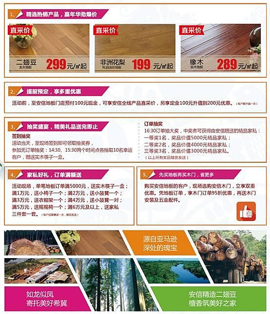 凡是安信地板的用戶,均可享受購買實木地?zé)岬匕?5年保用,實木地板20年保用的品質(zhì)承諾。廣大用戶放心購買,舒心使用。安信地板將秉承“用匠心挖掘和運用木材的天然優(yōu)勢持續(xù)改善人類的居住環(huán)境”的企業(yè)使命,用卓越的品質(zhì),勁爆的價格感恩回饋用戶。如果你現(xiàn)在還在為裝修選擇地板而苦惱,如果你還在魚龍混雜的地板品牌中,猶豫不決,飄忽不定,那不妨到安信地板嘉年華現(xiàn)場去看看,種類多,品種全,價格優(yōu),相信您一定不虛此行。活動詳情可至安信門店咨詢報名。