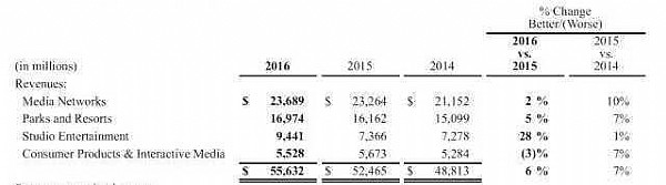 根據迪士尼的2016年報,其主要分為四大板塊:電視媒體、度假酒店和游樂園、娛樂事業部、延伸產品。從年報中看到,其2016年電視媒體收入236億美元、游樂場和酒店收入169億美元、娛樂事業部收入94億美元、衍生消費品55億美元,全年收入高達556億美元。
