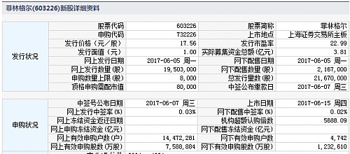 登陸資本市場(chǎng)的菲林格爾在2014-2016年分別實(shí)現(xiàn)營(yíng)收6.55億元、7.10億元、6.95億元,對(duì)應(yīng)的凈利潤(rùn)分別是4171萬(wàn)元、6723萬(wàn)元、7018萬(wàn)元。據(jù)菲林格爾披露2017年第一季度報(bào)中顯示,2017年1-3月公司實(shí)現(xiàn)營(yíng)收1.33億元,同期增長(zhǎng)30.25%,實(shí)現(xiàn)歸屬母公司股東凈利潤(rùn)750.57萬(wàn)元,同期增長(zhǎng)19.94%。而本次上市以15.56元/股作為發(fā)行價(jià),開(kāi)盤(pán)價(jià)25.29元/股,漲幅達(dá)44.02%,發(fā)行后總股本不超過(guò)8667 萬(wàn)股,由此可計(jì)算,菲林格爾的市值為21.92億元。