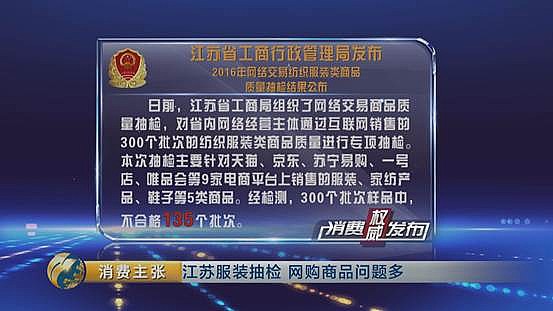 近期,江蘇省工商行政管理局發(fā)布2016年網(wǎng)絡(luò)交易紡織服裝類商品質(zhì)量抽檢結(jié)果。本次抽檢主要針對天貓、京東、蘇寧易購、一號店、唯品會等9家電商平臺上銷售的服裝、家紡產(chǎn)品、鞋子等5類商品。共300個批次,不合格135批次。