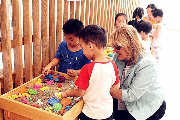 和玩沙盤(pán)的孩子親密互動(dòng)