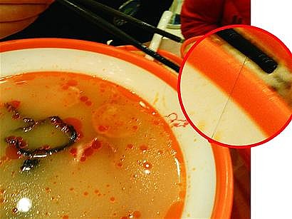 3月19日中午12點30分左右,市民肖女士與同事一行5人到“英雄煮”萬達店就餐,消費100元。就餐中,肖女士的同事從碗里撈出一根長約10厘米、淺棕色的頭發(fā)。見此情形,肖女士一行人頓時沒了胃口。“單位離這家餐廳較近,一周總有四五天在這里吃。之前有三四次吃出過頭發(fā),有一次還在碗里吃出過塑料袋。以前覺得自己是老顧客,不好意思提意見,以為該餐廳會改進,沒想到又出現(xiàn)了頭發(fā)!毙づ空f。